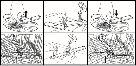 - Kontrollieren Sie die Sprüharme ob alle Öffnungen frei sind, falls sie verstopft sind, reinigen Sie diese gem. Gebrauchsanweisung.