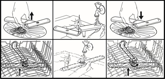 - Überprüfen Sie die Sprüharme, die Düsen müssen frei sein und sollten nicht verstopft mit Fremdkörper sein, falls doch, reinigen Sie diese gem. .